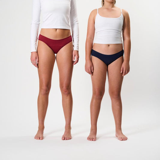 Innovation-led period underwear for active tween and teen girls. Styles for first and early years of menstrual cycle, period underwear for swim, dance and gym period panties, first period kits and more. Girls size 10-12(W2) - W14.